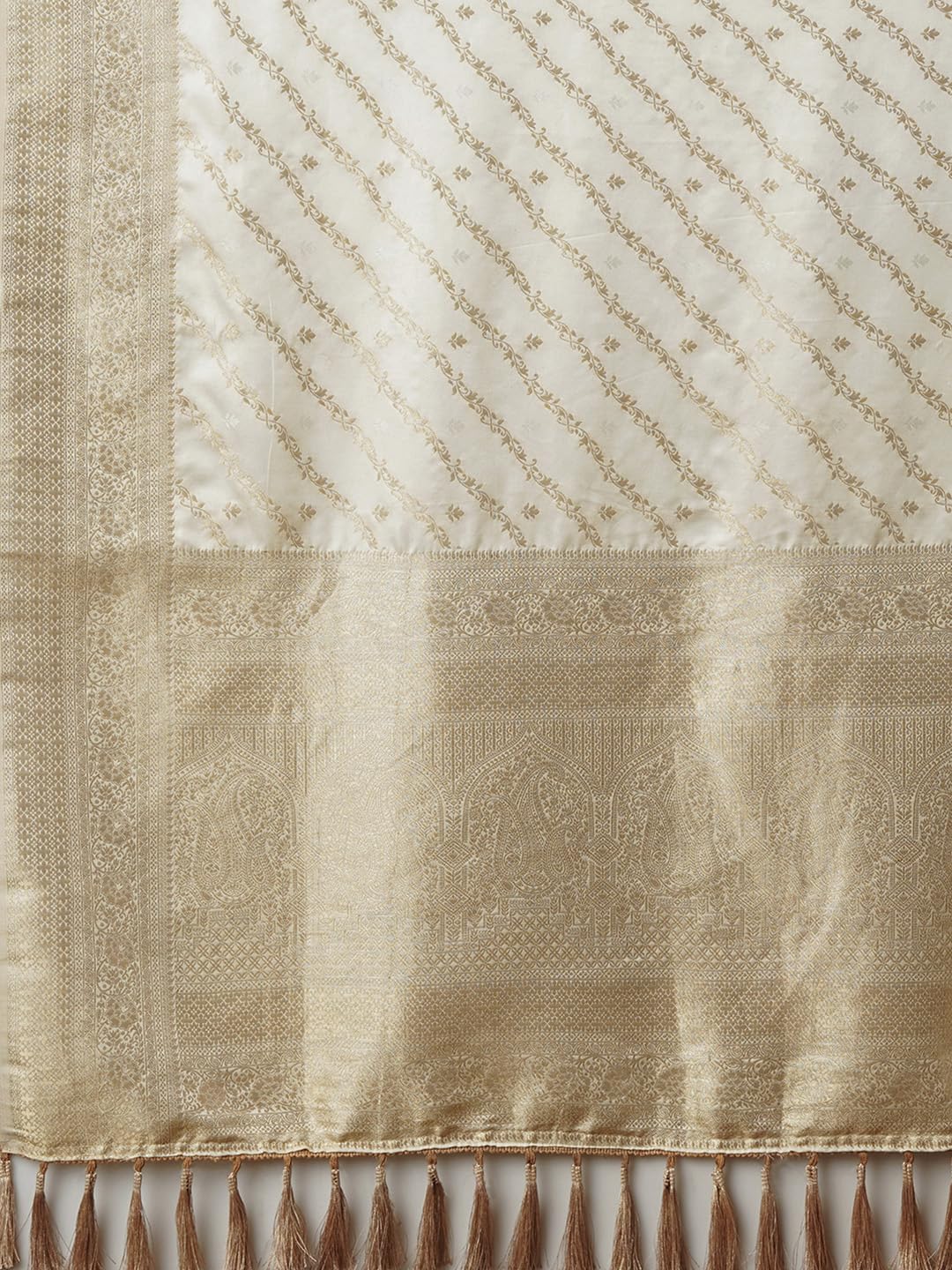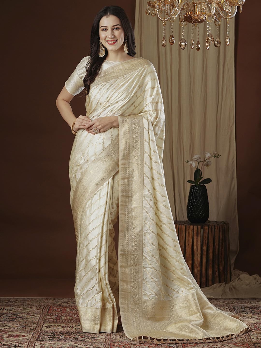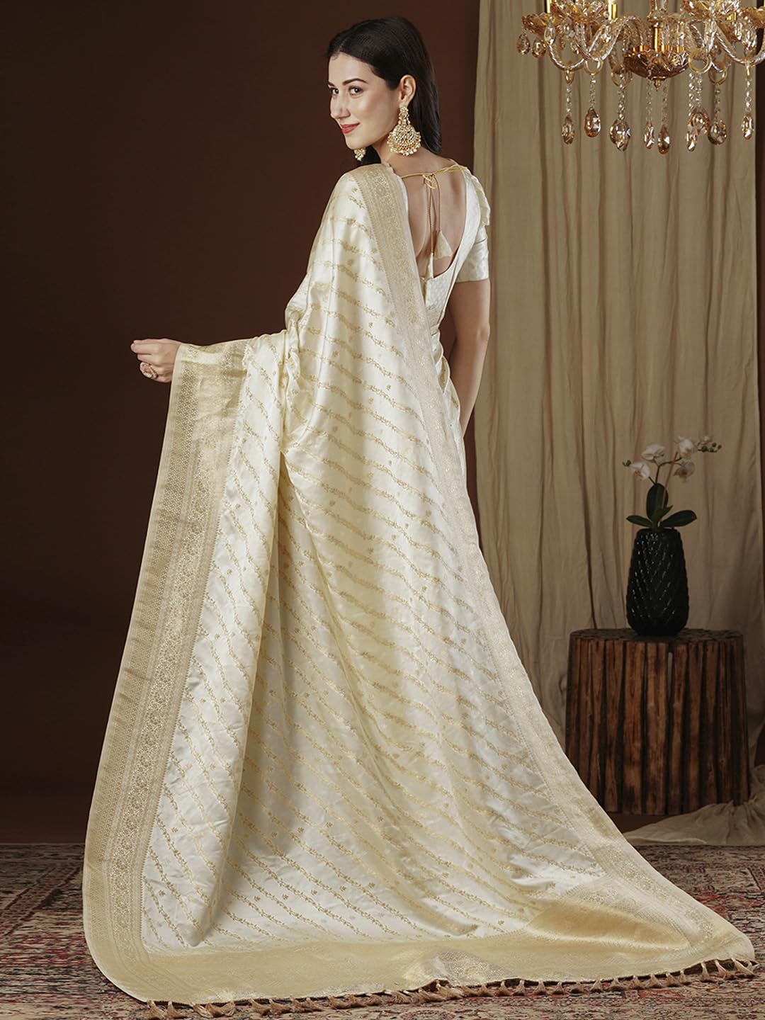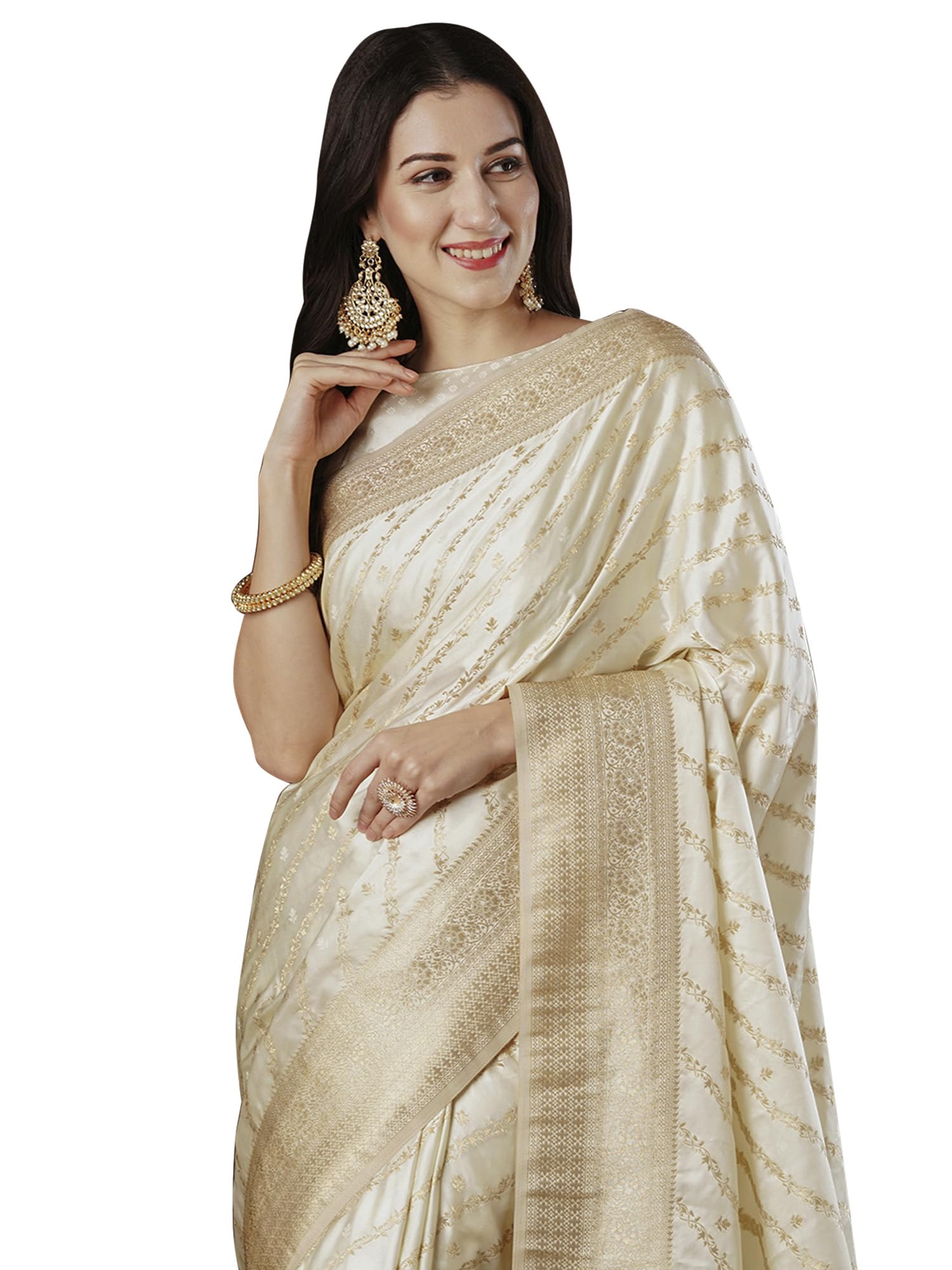 AKHILAM Women’s Off White Satin Silk Ethnic Motif Woven Design Saree With Unstitched Blouse (ARYA4405_FL)