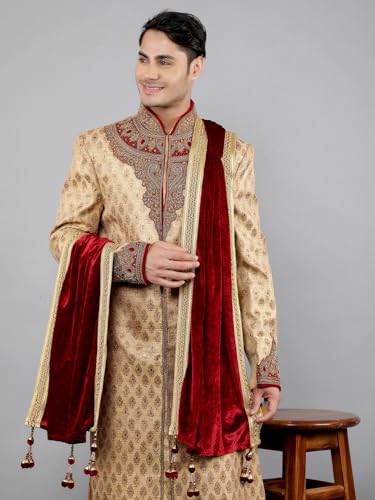 While deeply rooted in tradition, Sherwani designs have evolved to embrace contemporary elements that cater to the modern man. Innovative cuts, dynamic silhouettes, and fresh color combinations breathe new life into these timeless garments. Whether you prefer a completely classic aesthetic or a fusion of tradition and modernity, this beige Sherwani offers a sophisticated look that resonates with timeless elegance and fashionable flair.