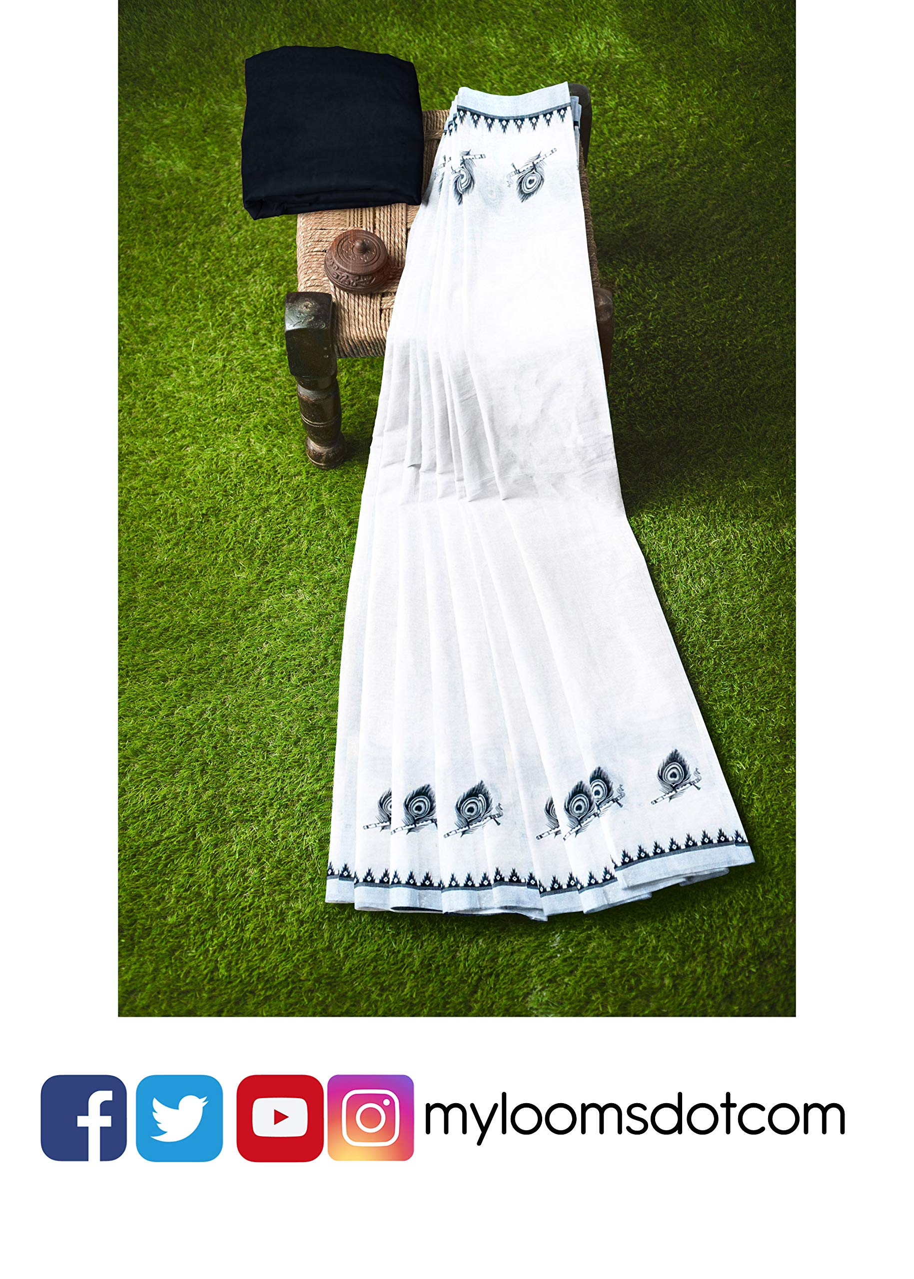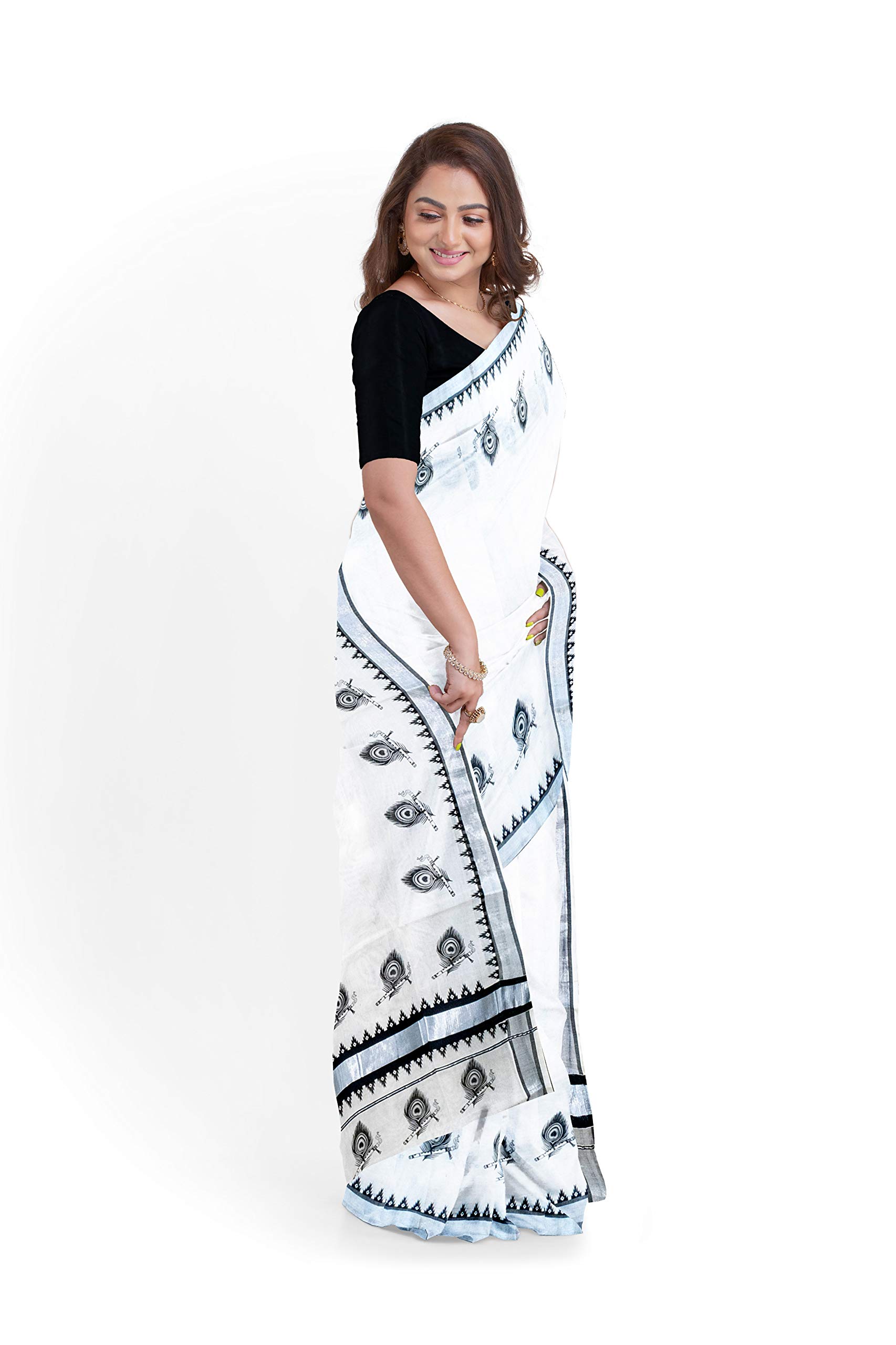 mylooms Womens Kuthampully Cotton Printed Kerala Saree Silver Black Set saree