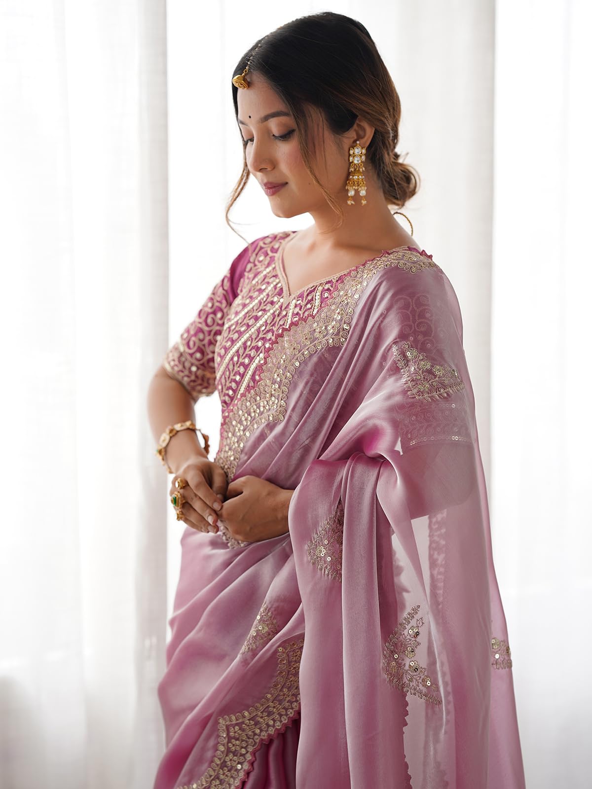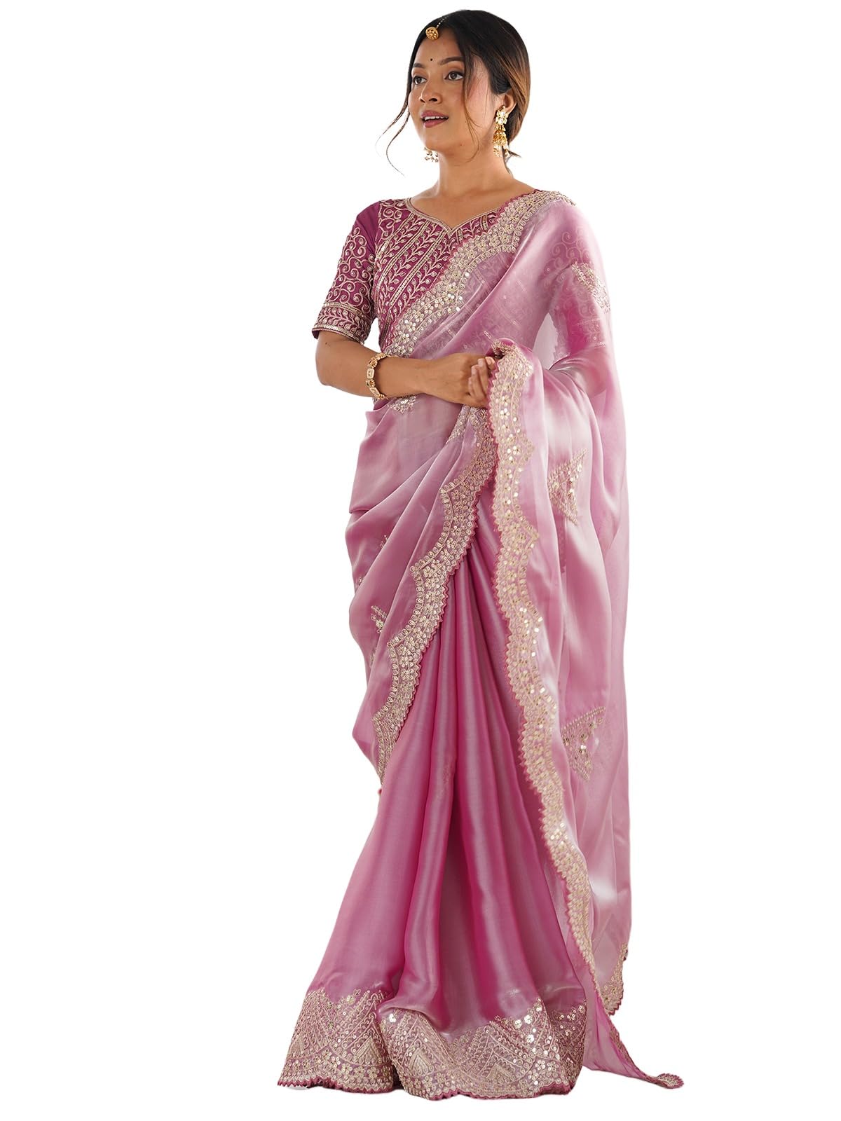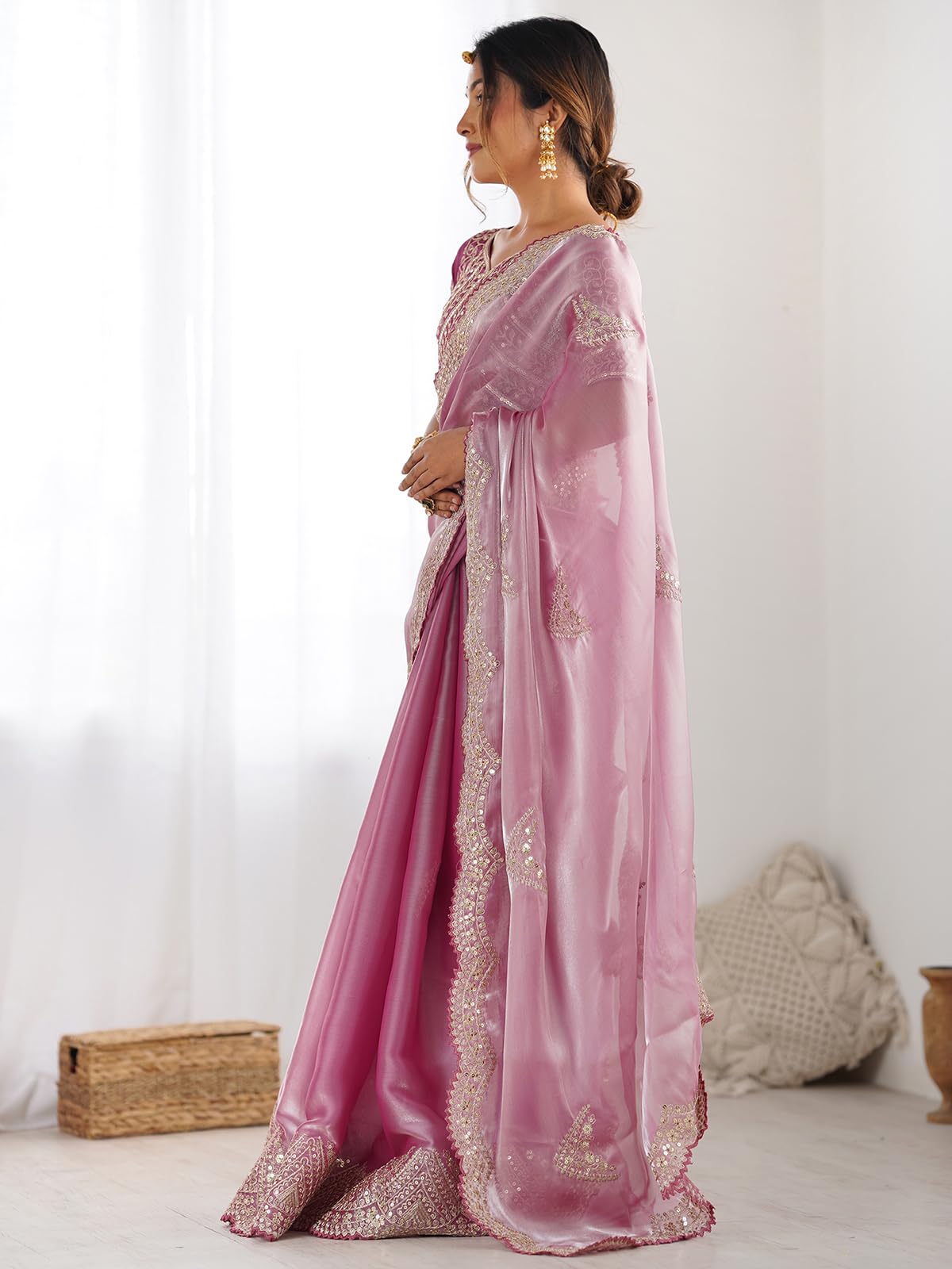 Satrani Women’s Tissue Silk Dyed Sequin Embroidery & Scollped Border Festive Saree with Unstitched Blouse Piece (4218S6633NA_Pink)