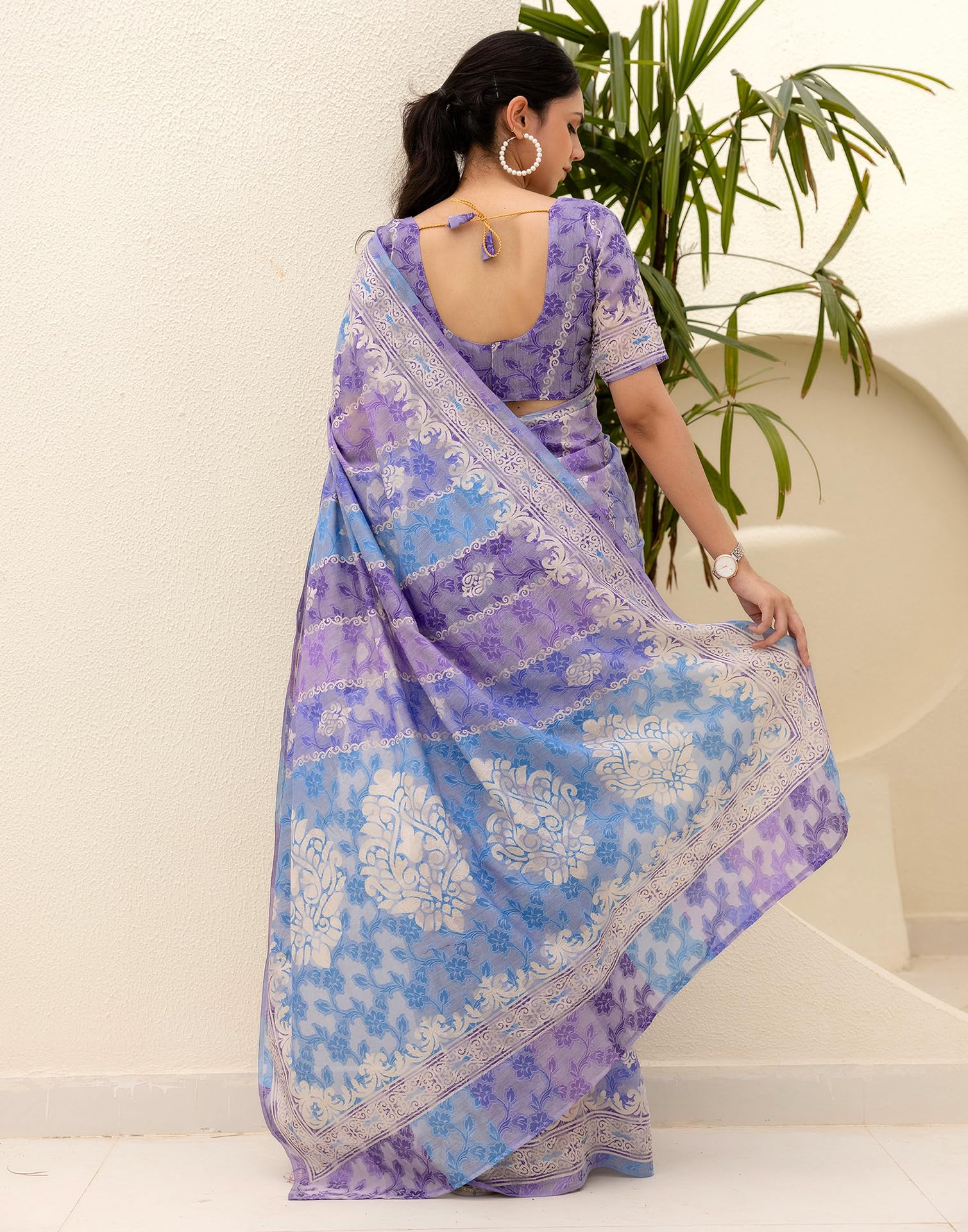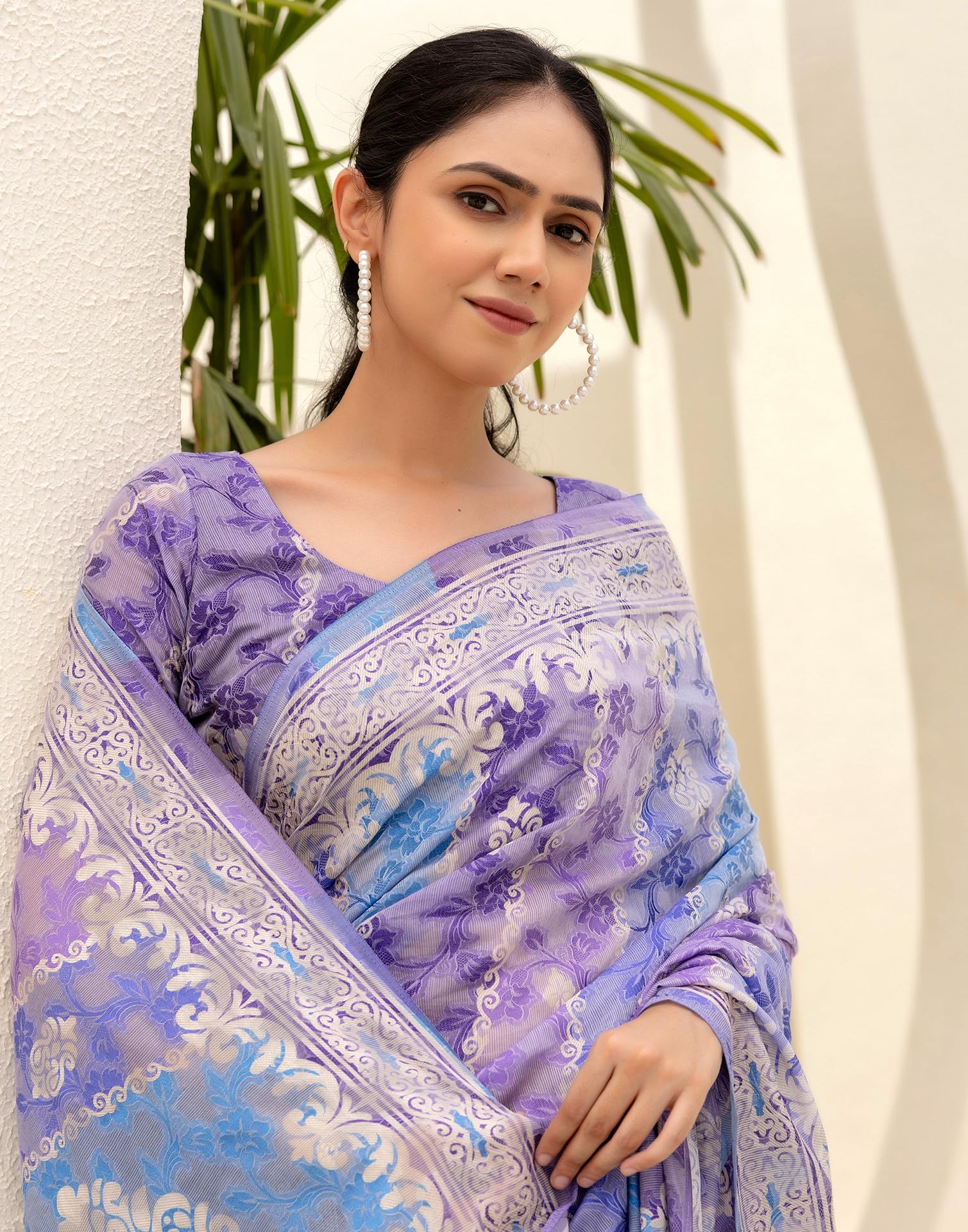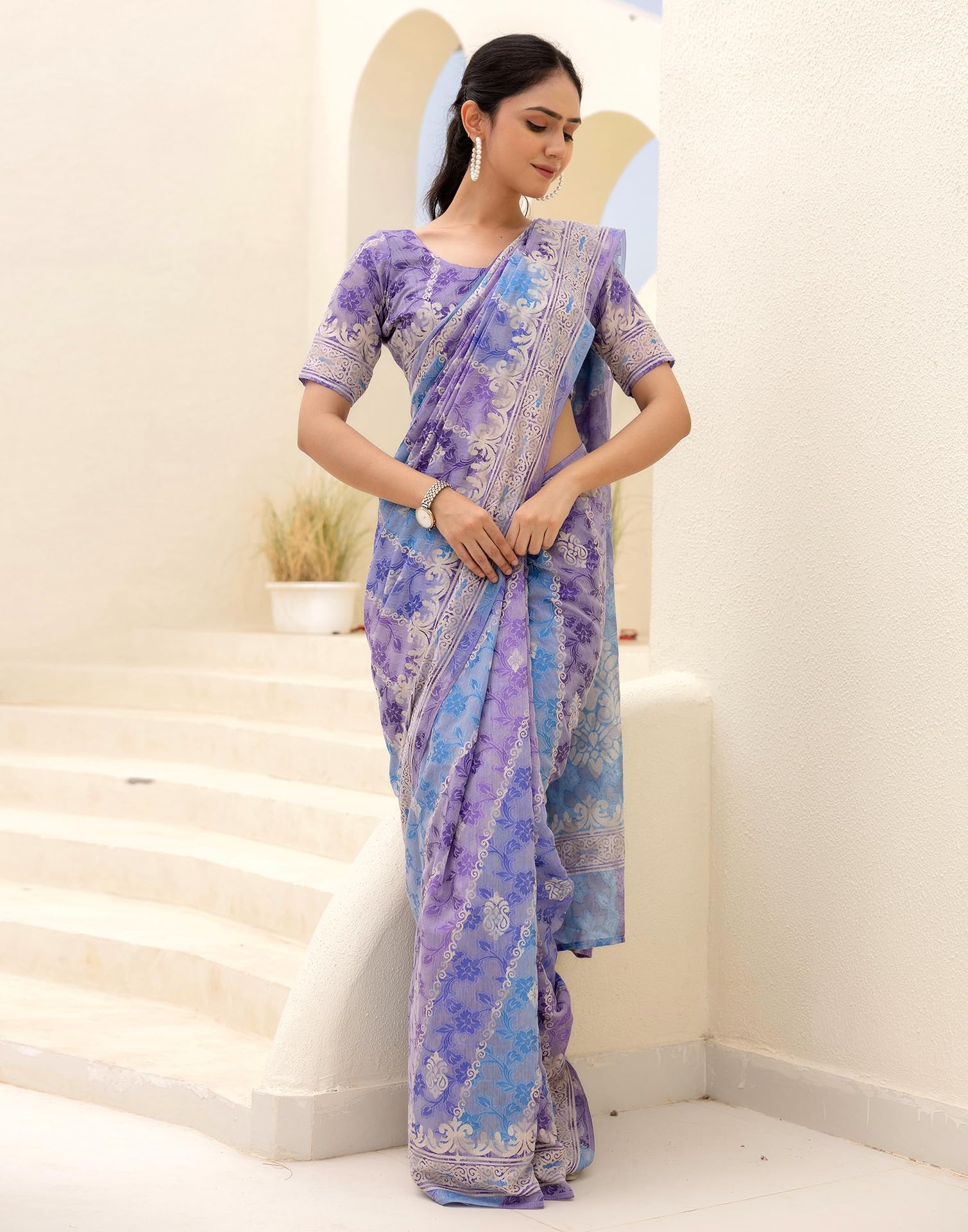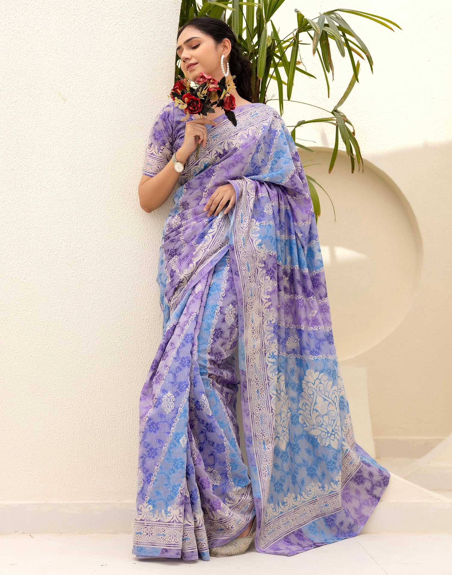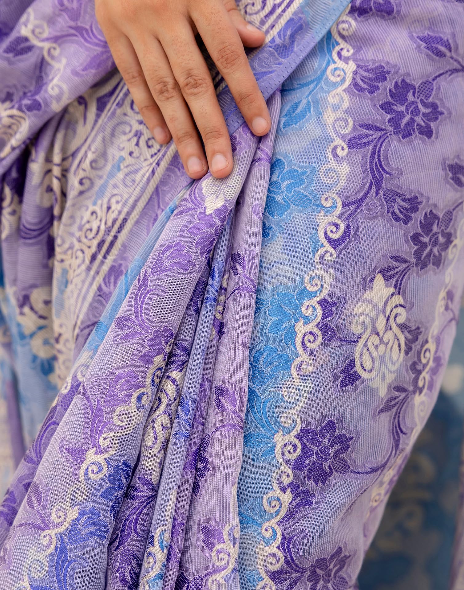 - Saree Details : Saree Fabric: Cotton | Blouse Fabric: Cotton | Saree Work: Printed, Weaving | Blouse Work: Printed, Weaving | Saree Color: Purple & Blue | Blouse Color: Purple