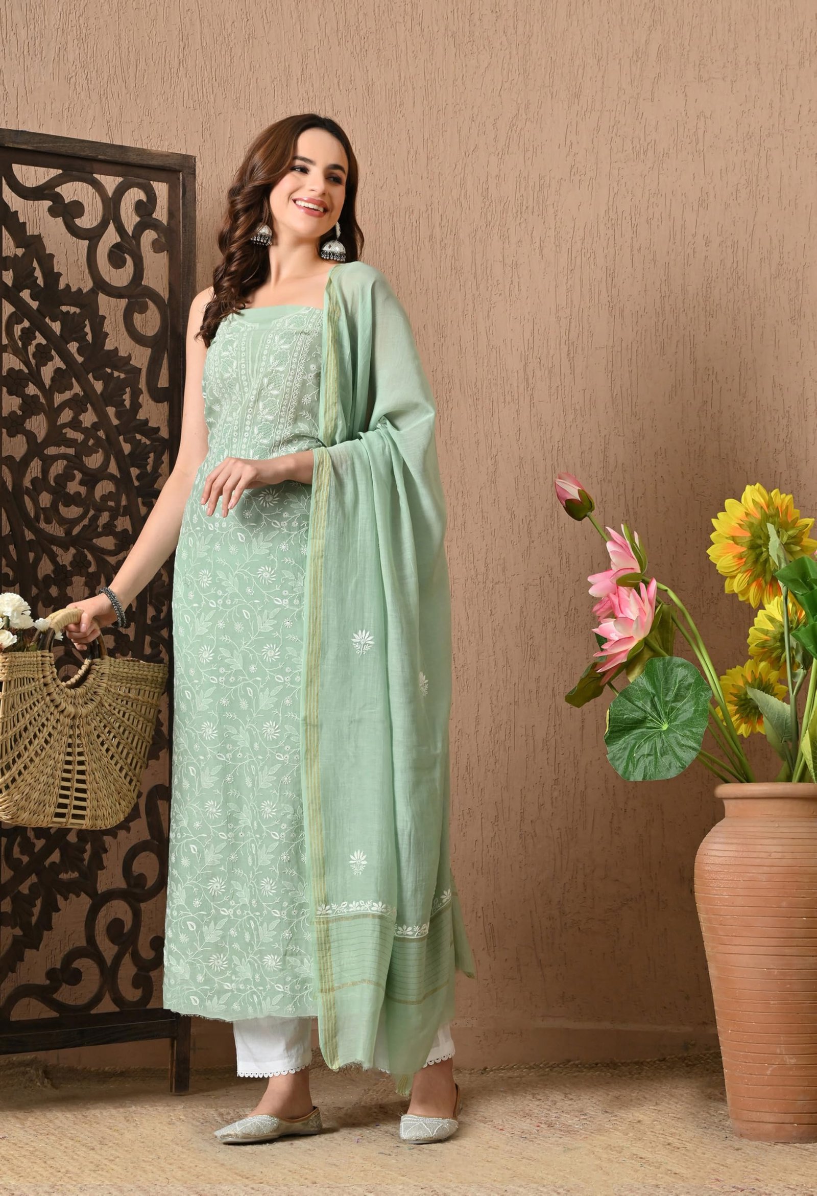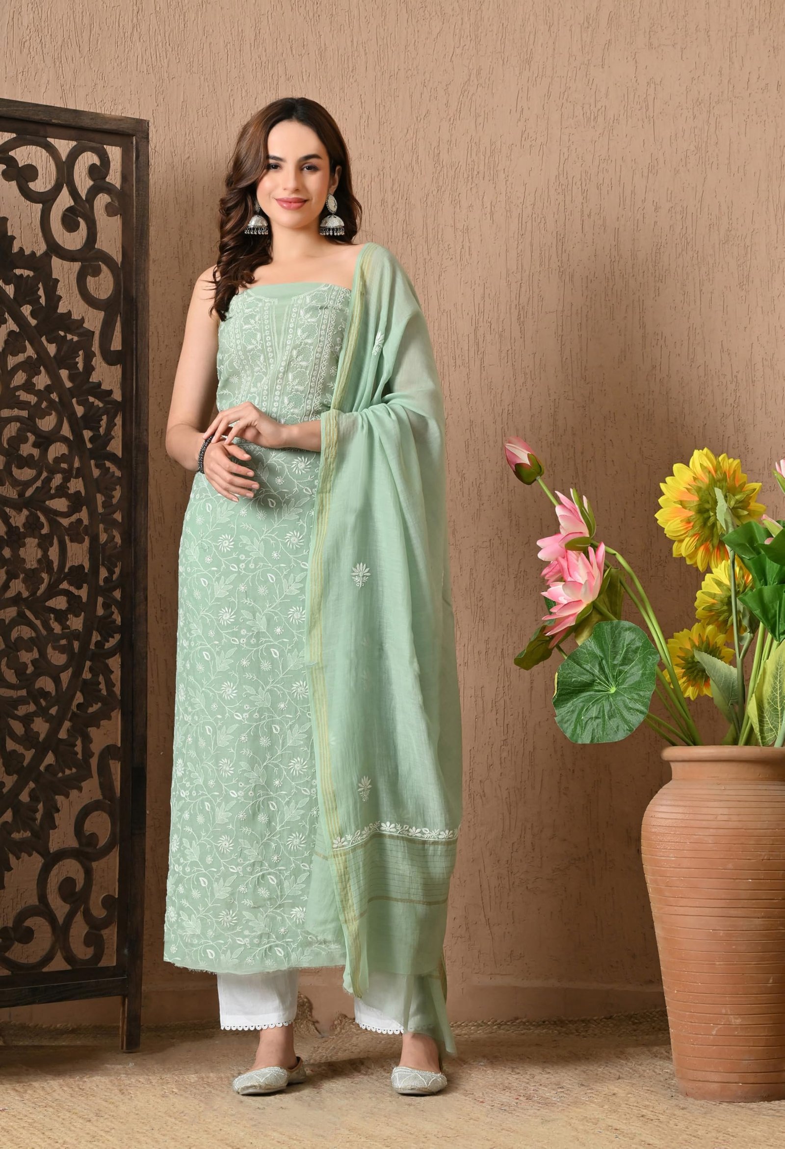 Embrace the freedom to design an outfit that’s unmistakably yours. The unstitched nature of this suit set allows you to customize the kurta and dupatta to match your individual style. Whether you prefer intricate stitching patterns or clean, minimalist designs, this fabric offers the ideal foundation for creativity. With its timeless appeal, this Chanderi suit set is the go-to choice for style-conscious individuals seeking to craft a unique, memorable look.